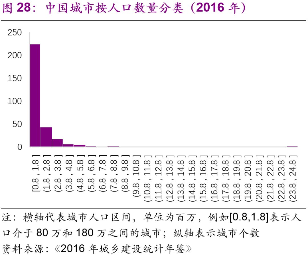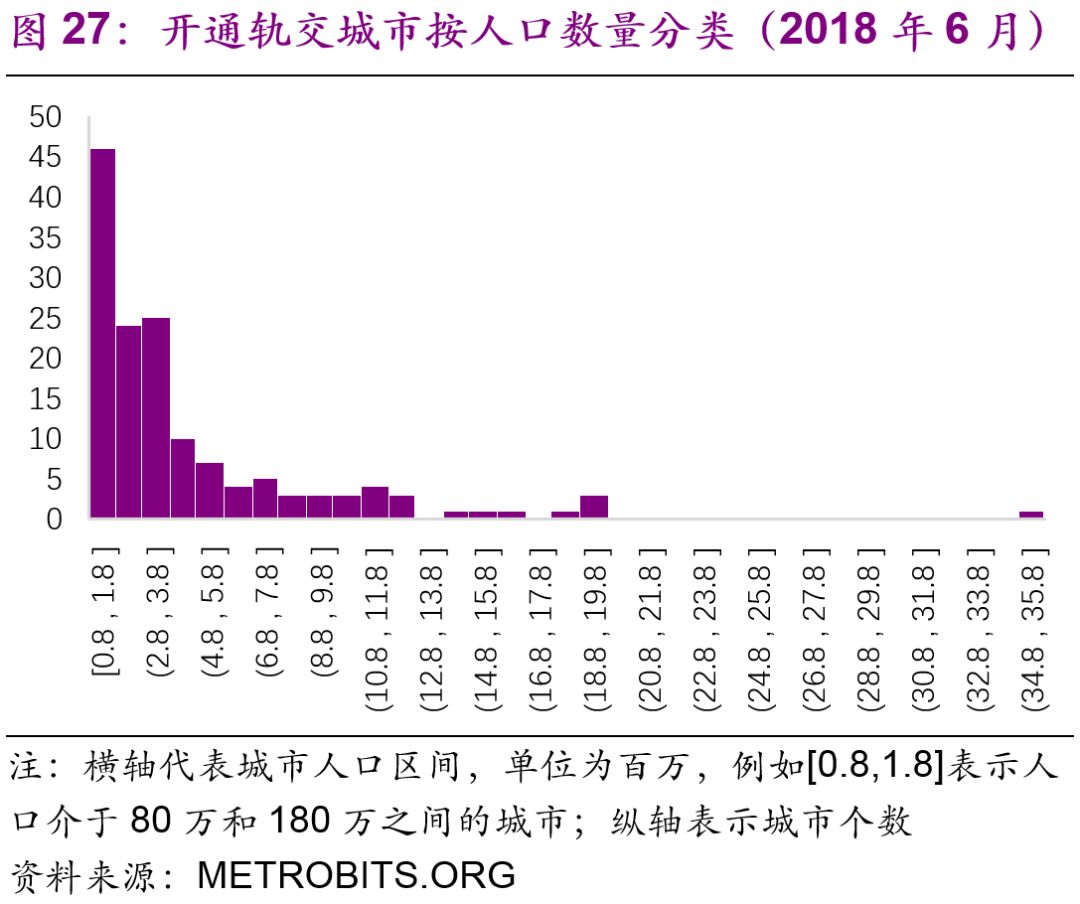 擬建地鐵、輕軌線路初期客運(yùn)強(qiáng)度分別不低于每日每公里0.7萬人次、0.4萬人次,遠(yuǎn)期客流規(guī)模分別達(dá)到單向高峰小時(shí)3萬人次以上、1萬人次以上。但是同時(shí)也強(qiáng)調(diào)了:“以上申報(bào)條件將根據(jù)經(jīng)濟(jì)社會(huì)發(fā)展情況按程序適時(shí)調(diào)整?!?016年,中國城市中市區(qū)常住人口在150萬以上的城市共有111個(gè),對(duì)比目前已經(jīng)開通軌道交通的城市數(shù)量(34個(gè)),仍有一定的發(fā)展空間。而從國際上看,建設(shè)軌道交通的城市人口的起點(diǎn)[19]大約為100萬(圖27),如果長期內(nèi)中國將建設(shè)軌道交通的人口標(biāo)準(zhǔn)下調(diào)至100萬,那么將有225個(gè)城市符合標(biāo)準(zhǔn)(圖28)。