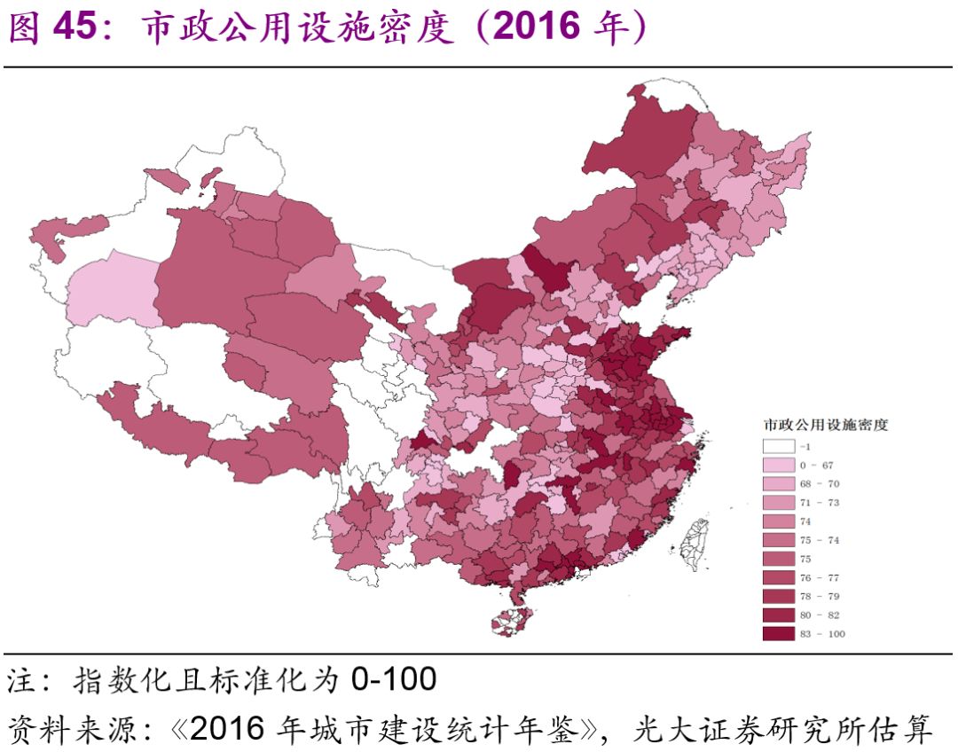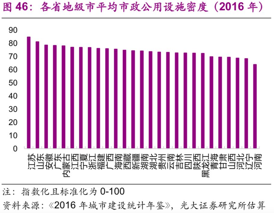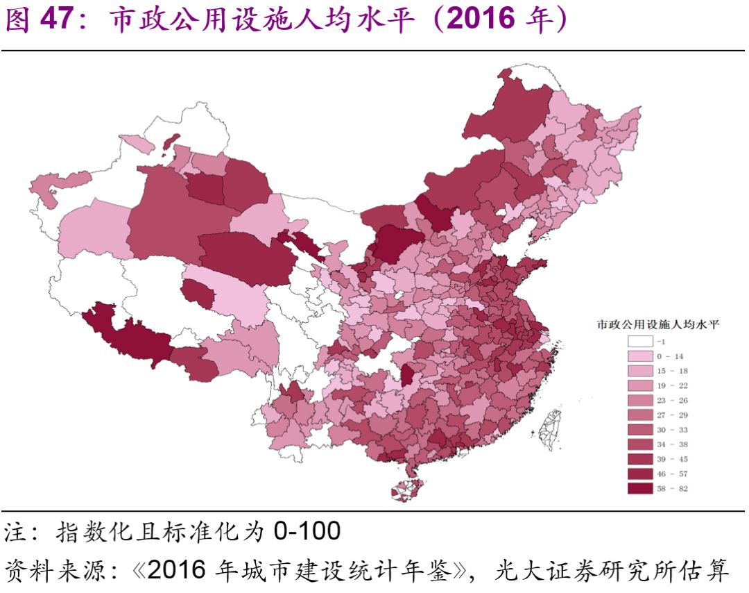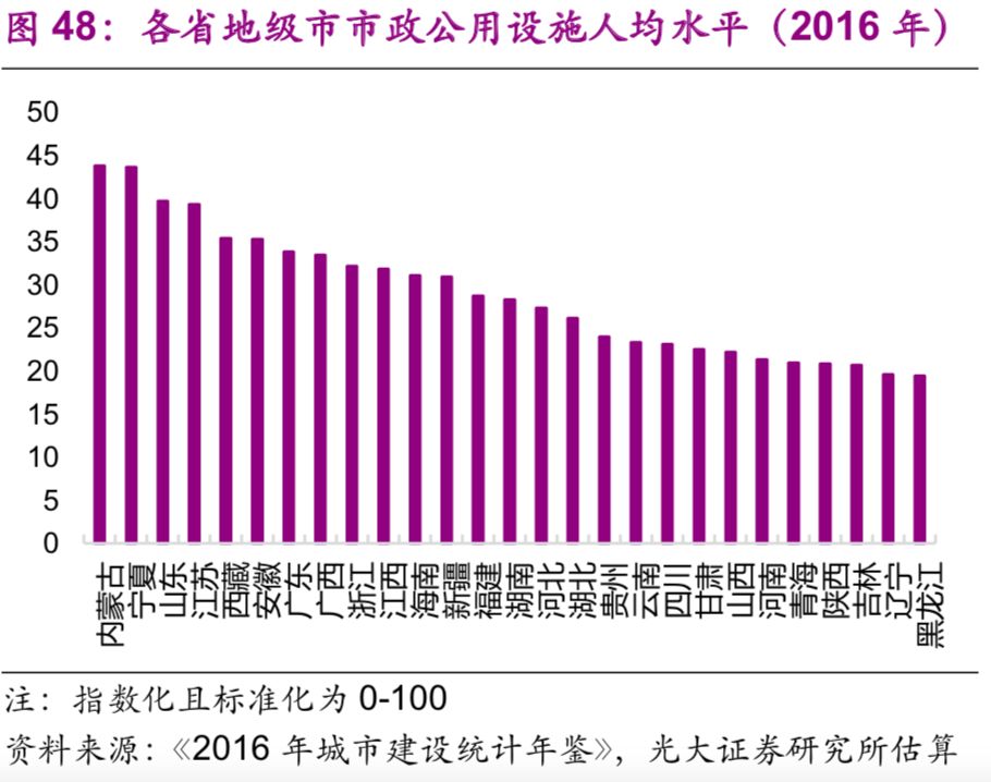 城市市政公用設(shè)施投資結(jié)構(gòu)不斷變化。隨著中國城鎮(zhèn)化的不斷推進(jìn),2016年投資額達(dá)1.7萬億元的城市市政公用設(shè)施投資結(jié)構(gòu)有了較大變化:1990年占據(jù)較大比重的燃?xì)猓?6%)、供水(20%)隨著滲透率觸及“天花板[26]”后比重下降較快,兩者2016年的比重分別為2%、3%;而更能體現(xiàn)城市功能升級(jí)的公共交通、道路橋梁等的比重上升較快,1990年兩者的比重分別為8%、26%,2016年則分別為23%、43%;此外,許多新型的城市市政公用設(shè)施投資開始出現(xiàn),例如地下綜合管廊,2016年占比達(dá)到了1.7%(圖44)。